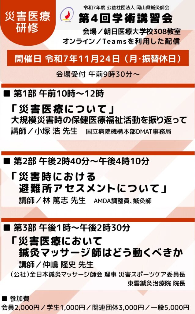 | 内容等 | ● 9時55分 開会 ● 10時~12時 「災害医療について」 大規模災害時の保健医療福祉活動を振り返って 講師/小塚 浩先生 国立病院機構本部DMAT事務局 ● 午後1時~午後2時30分 「災害医療において鍼灸マッサージ師はどう動くべきか」 講師/仲嶋隆史 先生 (公社)全日本鍼灸マッサージ師会執行理事 災害スポーツケア委員長 東雲鍼灸治療院 院長 ● 午後2時40分~午後4時10分 「災害時における避難所アセスメントについて」 講師/林篤志 先生 AMDA調整員、鍼灸師 ● 午後4時15分 閉会 |