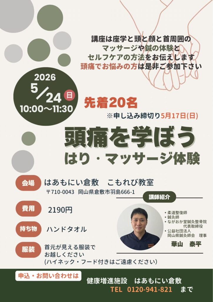 座学、頭と顔と首周囲のマッサージや鍼の体験、セルフケアの方法をお伝えします。