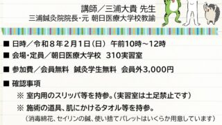 鍼通電療法 その3画像の拡大はこちら「運動器疾患 復習」■ 日時令和8年2月1日(日)午前10時~12時■ 講師/三浦大貴 先生・三浦鍼灸院院長・元 朝日医療大学校教諭■ 会場・朝日医療大学校 310実習室■ 参加費・会員 無料・鍼灸学生 ...